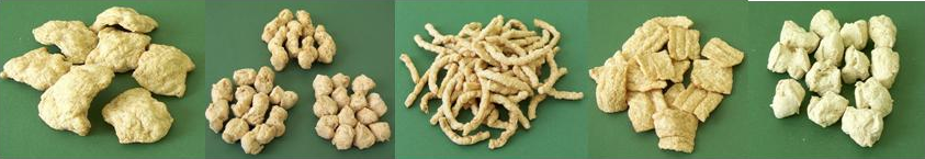 1 該膨化主機采用功能螺桿段組合設計,生產參數可實現自動精準控制;生產線以低溫豆粕、大豆分離蛋白、谷原粉等為主要原料,即可生產具有一定強度和韌性的組織狀蛋白食品,也可生產高強度和高韌性的肌纖維狀拉絲蛋白食品,形狀有圓柱、塊、薄片、細條、圓粒、方粒等,使高效生產高品質拉絲蛋白、組織蛋白食品成為可能。